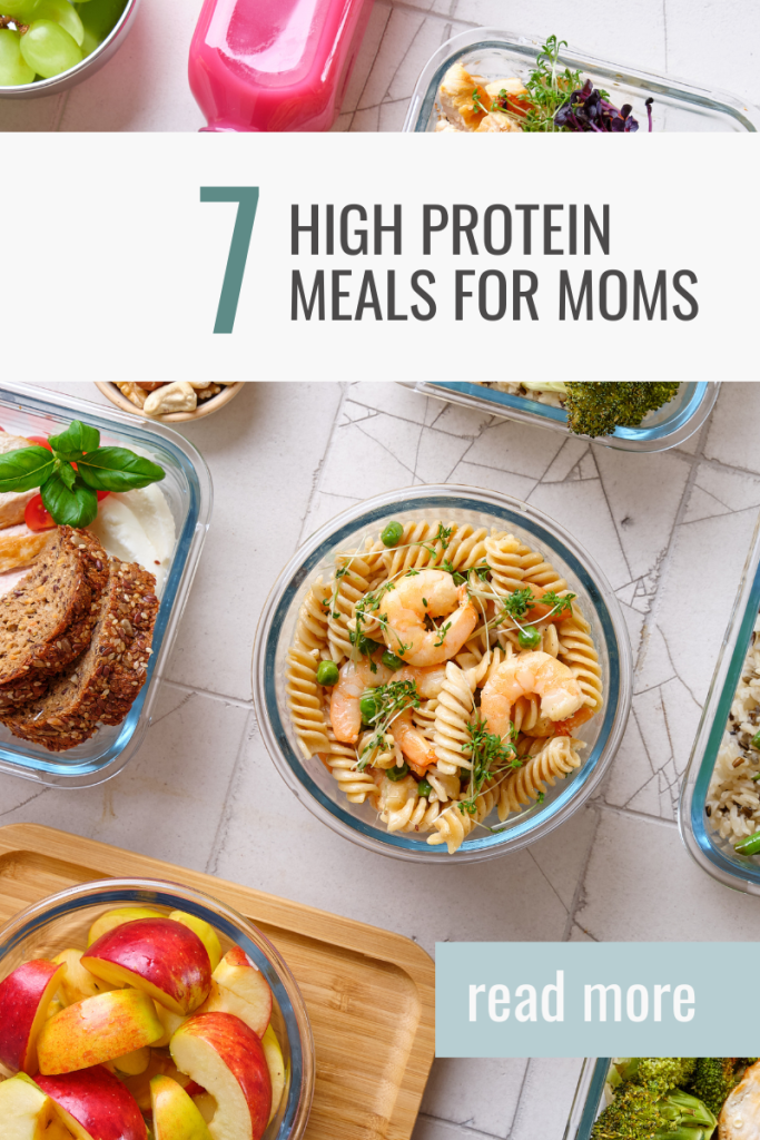 7 High Protein Meals Graphic with meal prep containers including shrimp pasta and apples